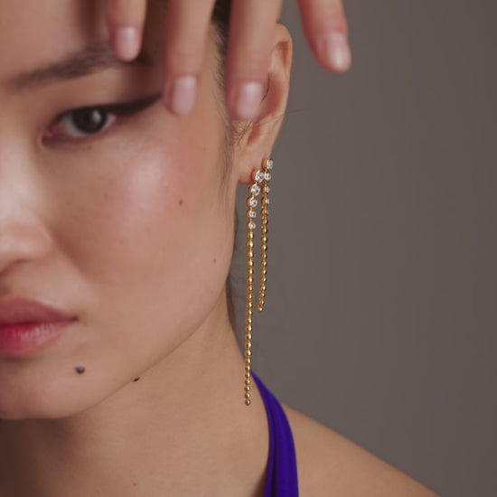 Our first-ever shoulder grazing earrings, these extra long drop studs feature rounded beads that graduate in size matched with cubic zirconia stones. Let them take centre stage as they move and flow in your ear stack, or team with pavé studs.