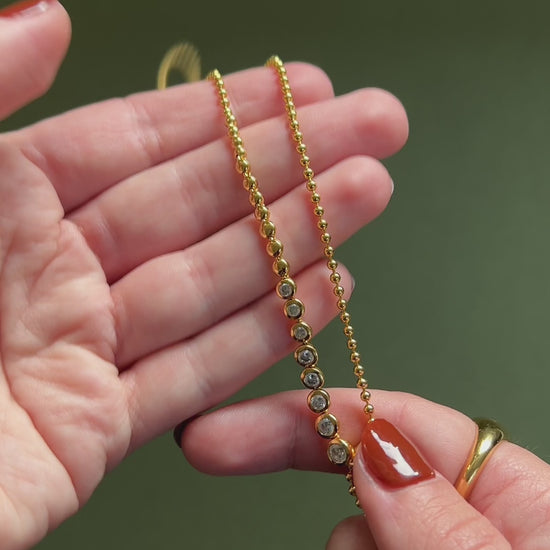 This statement lariat necklace features rounded cubic zirconia stones and a slider for added versatility. Wear as a choker, medium necklace, or reversible for a plain gold look.