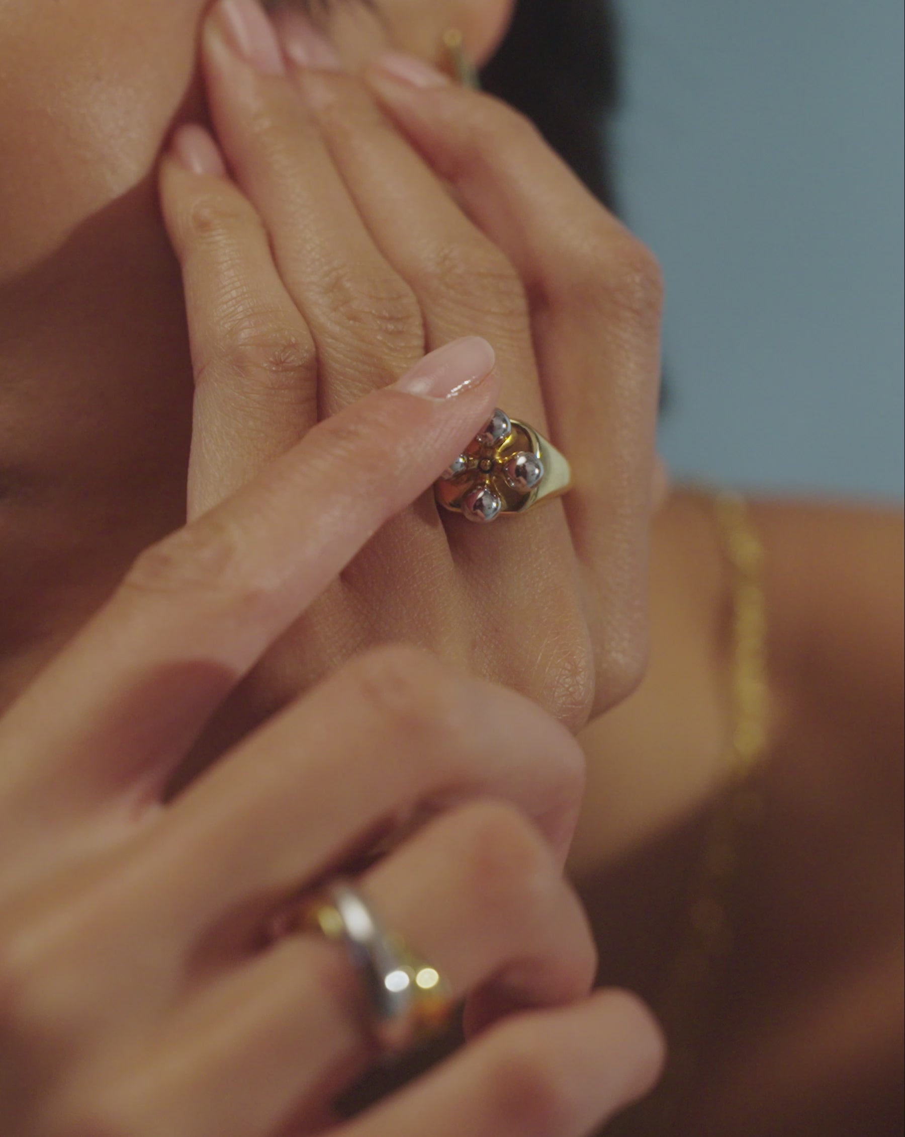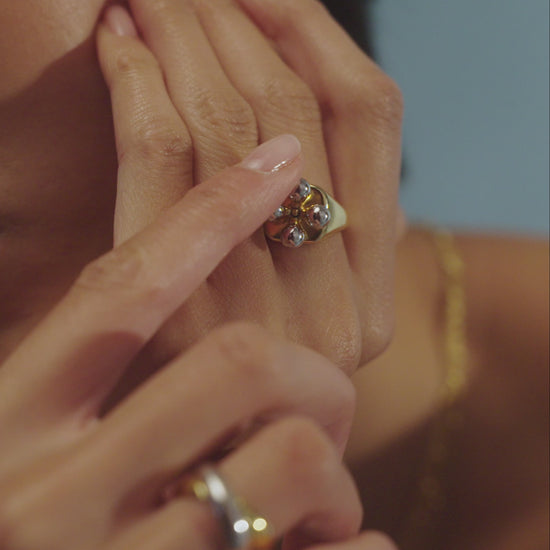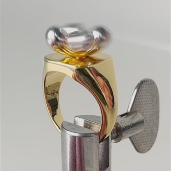 In partnership with The Flag Twins. Inspired by good vibrations, this one-of-a-kind unisex signet ring features a central spinning mixed metal atom design. Let it take centre stage or contrast with more delicate stacking styles.